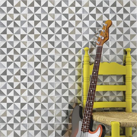 O patchwork Thai Pardo, de 10x20cm, trazem uma textura envelhecida, com tons pasteis muito elegantes. São vendidos em peças individuais e aleatórias, e podem ser paginados entre si ou com os azulejos Etnia Blanco.