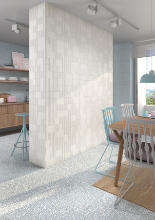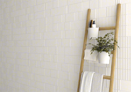 Os azulejos Pincio, de 10x20cm, são um patchwork de relevos e texturas, vendidos em peças individuais e aleatórias, e podem ser paginados entre si ou com os azulejos Corso.
