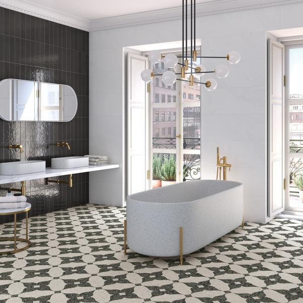 Indicado para revestimentos de piso e parede, Octógono Cerbere Negro permite diversas paginações, sendo uma cerâmica versátil tanto para ambientes contemporâneos quanto para aqueles com ar mais retrô.