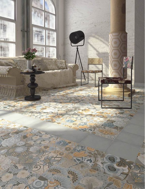 Produzido na Espanha em porcelanato de alta qualidade, o ladrilho Patchwork Flore Gris propõe um toque despojado.
